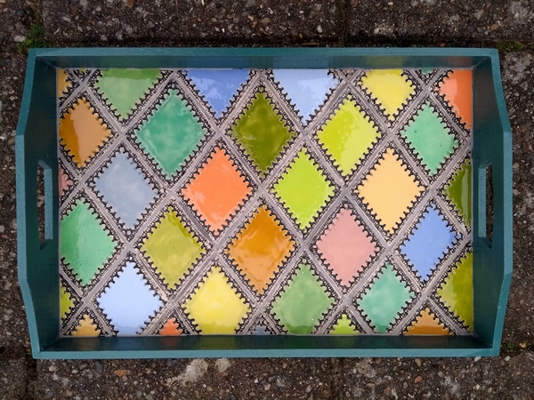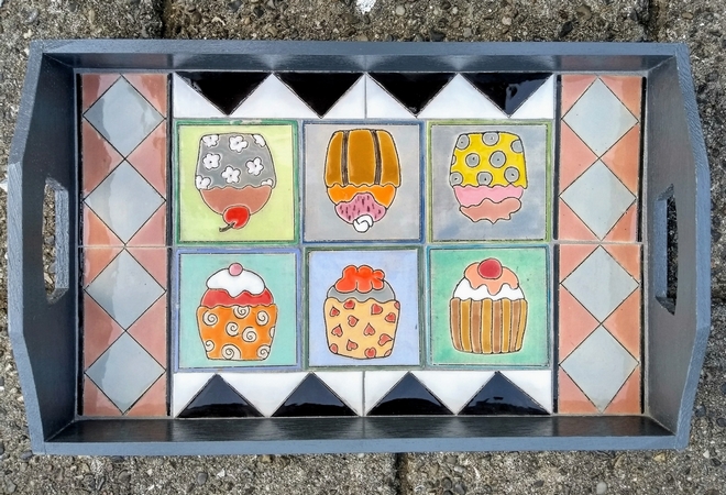 Mosaik i vægbilleder og serveringsbakker inden døre kan fungere.