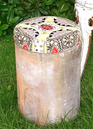 BORD: Genanvendt drænrør monteret med beton og beklædt med mosaik og dele af keramik, som Coffee Cat'en.